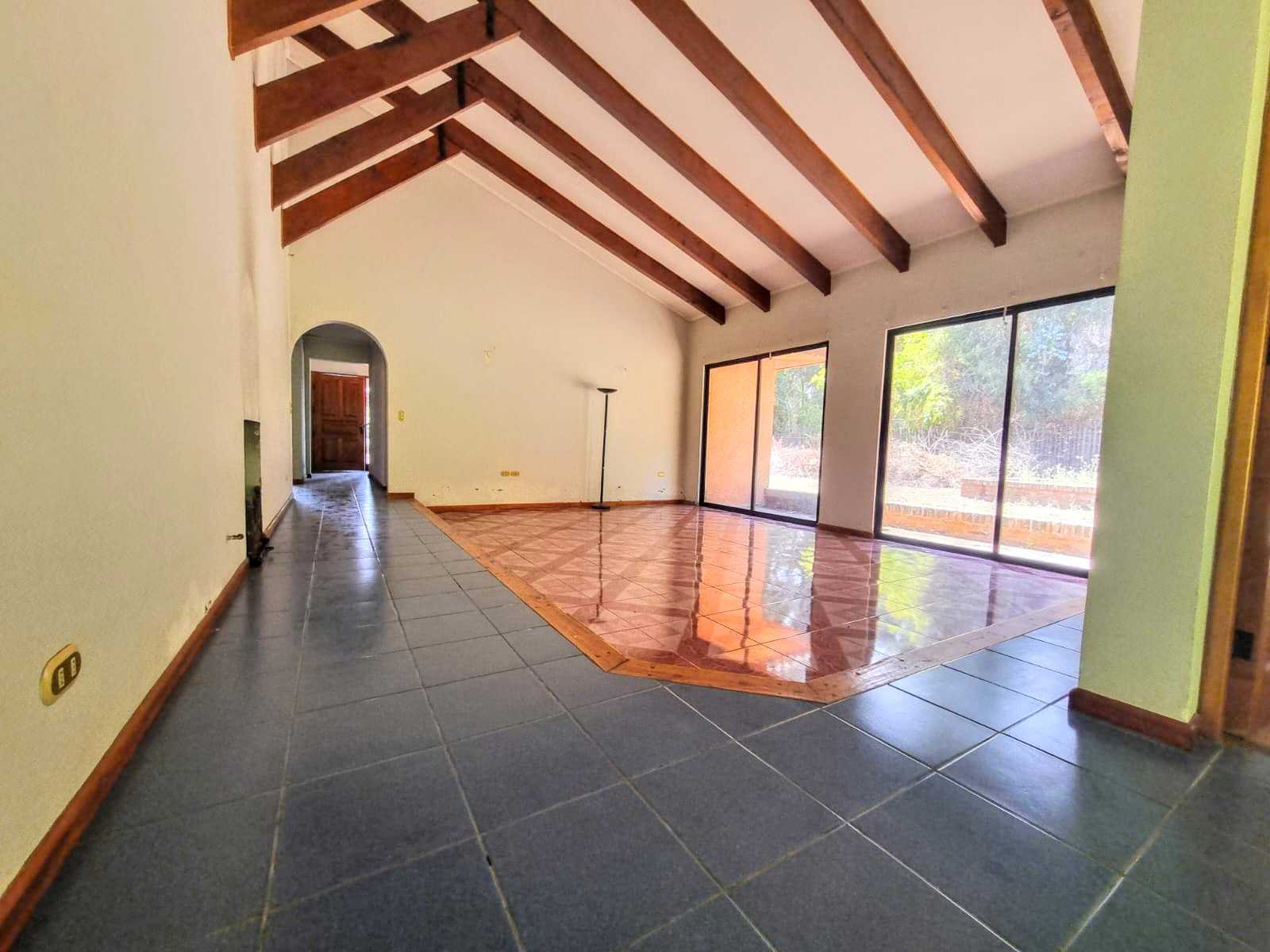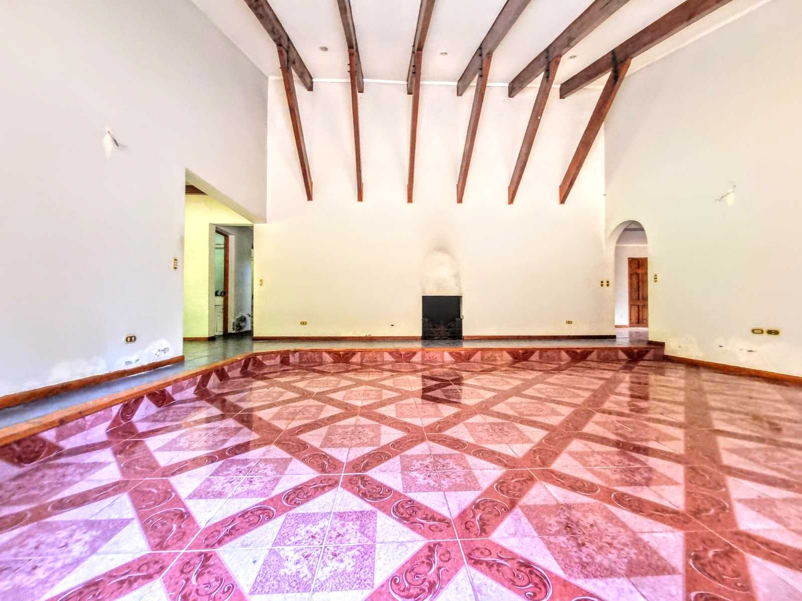 - Amplio Living de doble altura con vigas a la vista, chimenea frontal y vista al patio.
