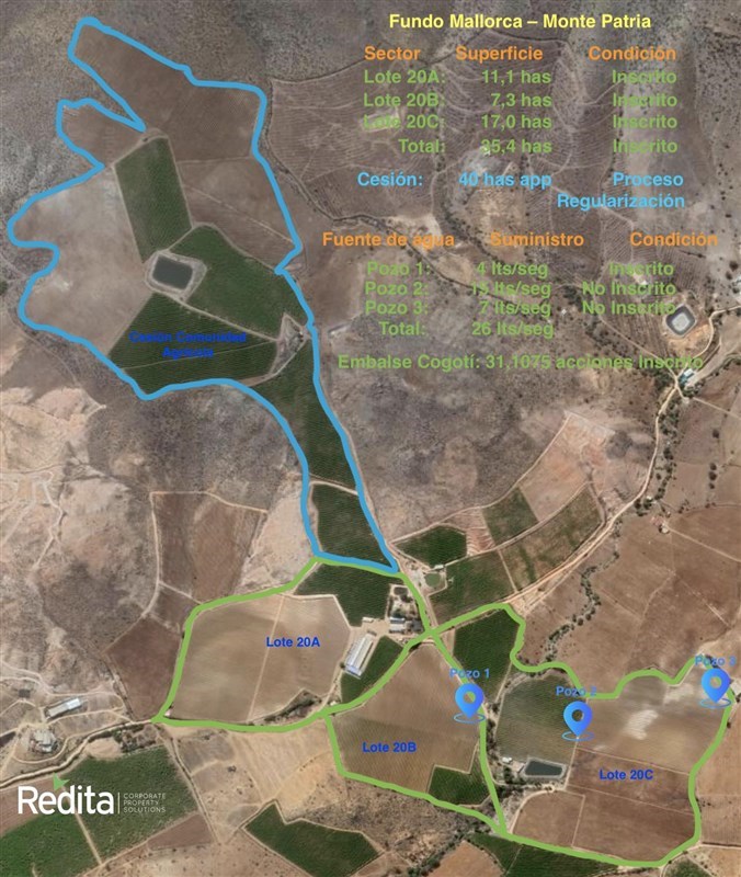Dispone de una dotación hídrica relevante con 31,11 acciones del Estero Cogotí y 1 pozo, además cuenta con infraestructura productiva instalada por empresa exportadora, lo que permite reiniciar actividades agrícolas de manera inmediata.