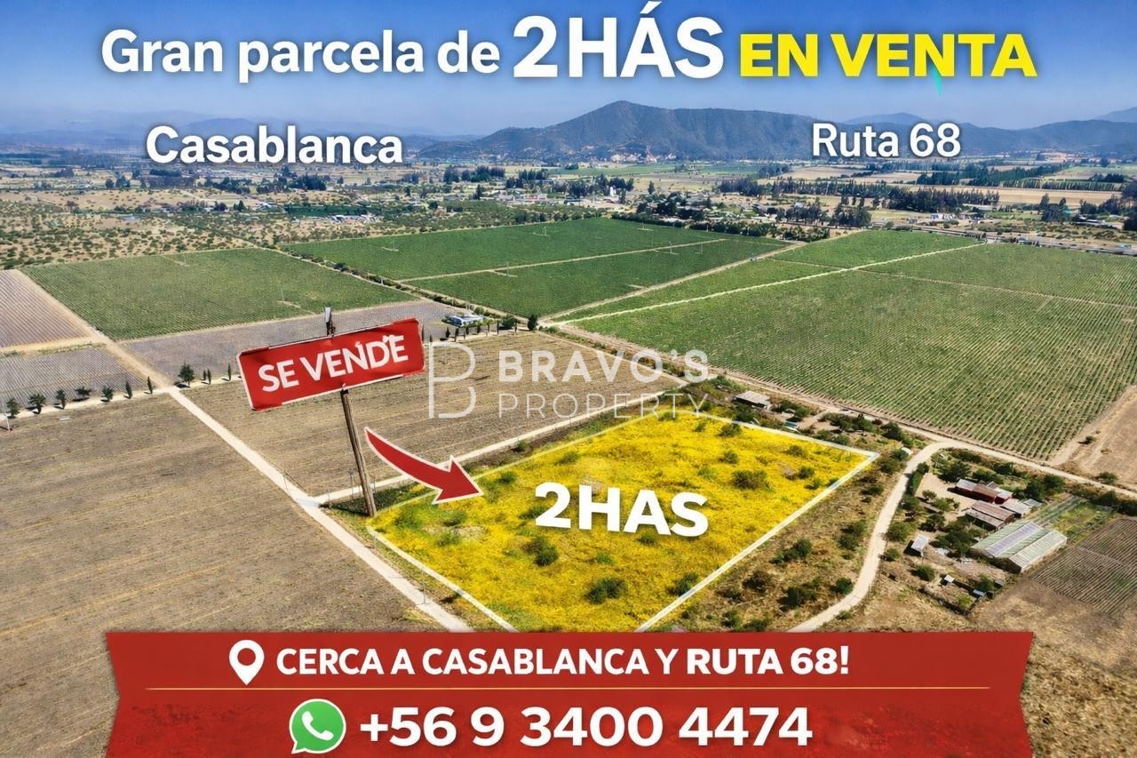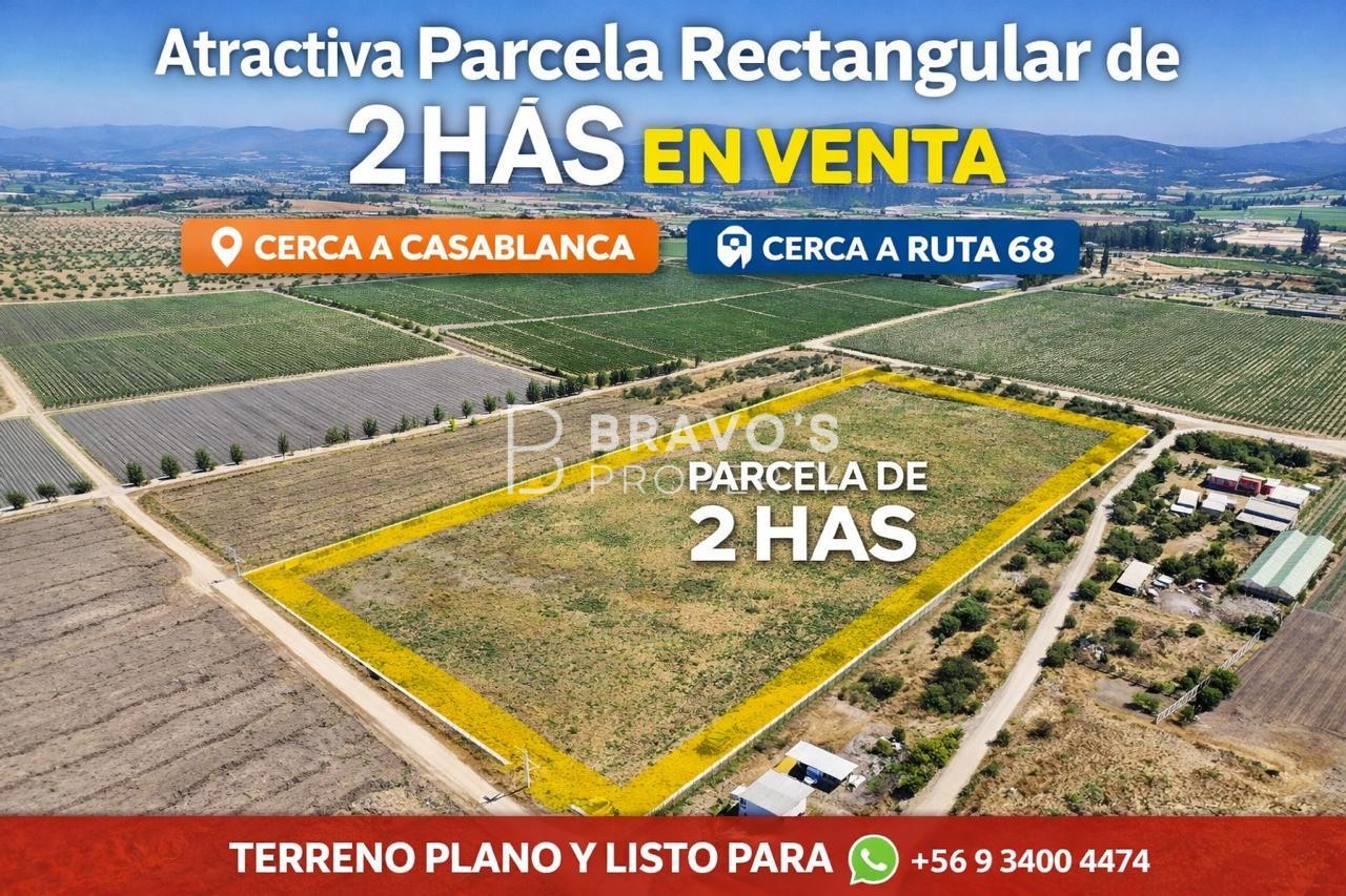 Parcela de Ensueño en Nuevo Mundo, Casablanca\n\nUbicada en el sector Nuevo Mundo, esta hermosa parcela agrícola de 20.000 m2 es una oportunidad única para aquellos que buscan un lugar de descanso y tranquilidad en un entorno natural privilegiado. Rodeada de hermosas plantaciones de viñas viníferas, como Indómita y Viña Mar, ofrece vistas inigualables a las plantaciones vitivinícolas.\n\nUbicación Privilegiada\n\n- A solo 1.200 metros de la ruta 68\n- A 35 minutos de Santiago y 25 minutos de Viña del Mar\n- En el corazón de la ruta del vino de Casablanca, con acceso a restaurantes y viñas cercanas\n- Próxima a la Ciudad de Casablanca, con todas las comodidades y servicios\n\nCaracterísticas de la Parcela\n\n- Agua potable, energía eléctrica y agua de riego captada de pozo\n- Sin construcciones, lo que permite diseñar y construir desde cero\n- Terreno plano y aprovechable en su totalidad, ideal para agricultura o construcción de hogar\n\nInfraestructura\n\n- Cercos perimetrales para seguridad y privacidad\n- Puente de acceso seguro y práctico\n- Luz y sistema de abastecimiento de agua de pozo construido y operativo \n\n- KP470383 - KPT040802 - \n - Publicado usando KiteProp CRM Inmobiliario