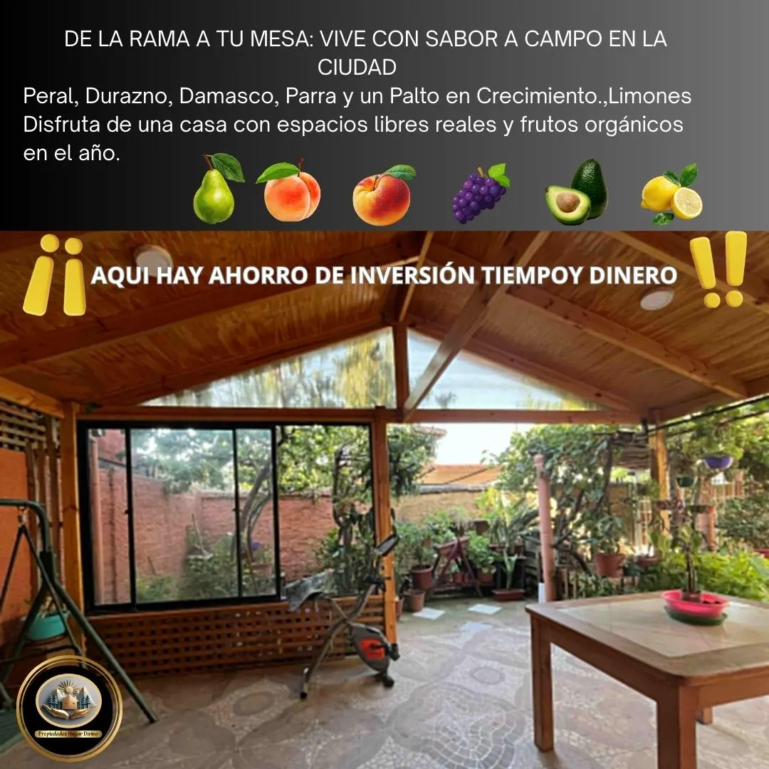Árboles frutales en producción: limoneros, naranjos, perales, manzano, damasco, parrón con uvas, durazneros tradicionales y nectarines.