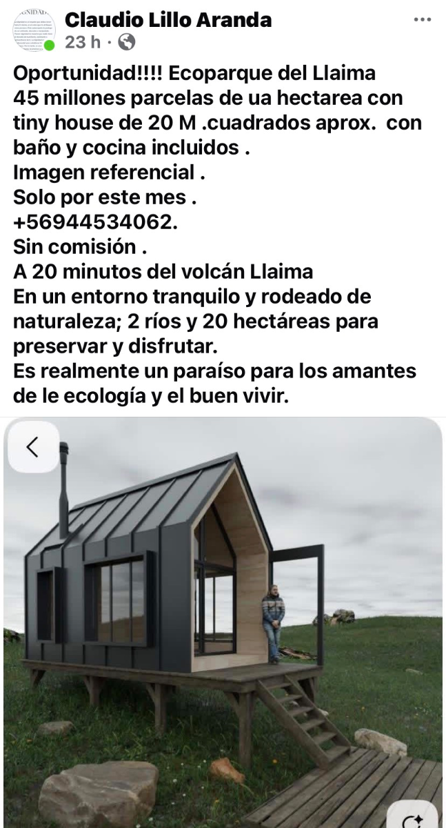 En un entorno privilegiado rodeado de ríos y bosques nativos nace ecoparque del Llaima ; solo 37 parcelas de una hectárea y 20 hectareas de conservación. Proyecto consolidado solo quedan 12 unidades . Además cuenta con casa residencia para que mientras construyes puedas quedarte a ver los avances .