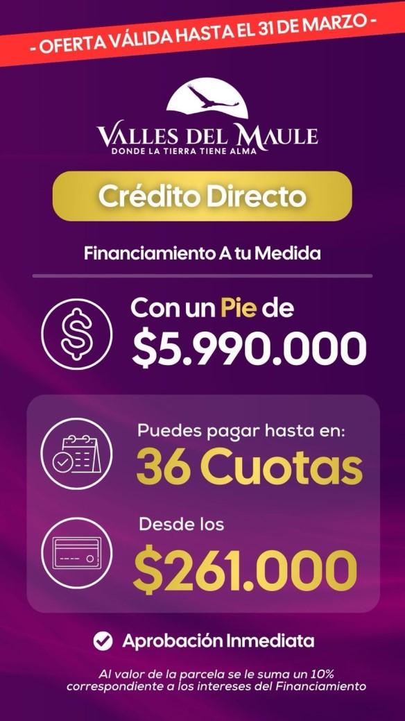 VALLES DEL MAULE \nRegión del Maule, sector Los Coipos.\nQuieres vivir con un estándar del sur de Chile en la zona del Valle del Maule?\n Y sin costo de comisión. Llámanos ¡Será un placer ayudarle a conocer más sobre nuestro hermoso proyecto Valles del Maule! \n\nParcelas de 5.000 mts2, con senderos de trekking en una amplia zona de conservación, con zona de picnic con acceso al estero y con Gimnasio Municipal, todo dentro del proyecto! Al lado de la carretera que une Lolol y Hualañé.\nVen a vivir a Valles del Maule, parcelas planas desde los $13.990.000 hasta los $15.990.000 y otras con fantásticas vistas desde los $15.990.000 hasta los $19.990.000. Ven a conocer esta primera etapa en sectores Los Toros y Los Potros.\nQué más ofrecemos? Sala de Basura y manejo de residuos, caminos interiores estabilizados con 15 cms de ripio y 5 cms de maicillo, de 10 metros de ancho total, portón de acceso al proyecto, parcelas con rol propio, autorizadas por el sag, listas para escriturar. Las parcelas con orilla de estero cuentan con Estudio Hidráulico¡ Puedes elegir parcelas planas, semiplanas, parcelas con vistas, parcelas con orilla de estero, parcelas con vegetación, despejadas, etc.\nCómo es la factibilidad de agua y luz?\nEl agua es factibilidad por medio de pozo a unos 15 o 30 metros de profundidad por construcción propia (mientras más profundo el pozo, mayor posibilidad de permanencia de agua) o como segunda opción por camiones aljibe. Podemos asesorarlo/a gratuitamente. Valles del Maule por estar cerca de los cerros, tiene una excelente cantidad y calidad de agua.\nLa luz por empalme eléctrico, gestión propia o de la comunidad. El cableado eléctrico pasa por al lado del proyecto, en la carretera. Ya tenemos parcelas vendidas que gestionaron su electricidad. O puede gestionar Panel Solar. Le ofrecemos asesoría gratuita si así lo requiere.\nRESERVAS a $350.000 para gastos notariales, con vigencia de 10 días hábiles. \nContamos con el prestigio del Desarrollador Visualiza con gran experiencia y excelencia en proyectos del sur de Chile.\n\nDónde firmamos escrituras?\nEn la Primera Notaría de Providencia. O en la Notaría de Puerto Varas en la Decima región. O en notaría de la zona de Hualañé.\n\nFORMAS DE PAGO efectivo o transferencia.\n- CONTADO \n- CRÉDITO DIRECTO con Pie desde $5.990.000 y el saldo hasta en 36 cuotas.\n\nUBICACIÓN ESTRATÉGICA revisa aquí: 3 hrs. de Santiago.\nA 2:18 hrs. de Rancagua.\nA 1:14 hrs. de Curicó.\nA 2 hrs. de Rapel.\nA 1.27 hrs. de Pichilemu.\nA 53 min. de Bucalemu.\nA 1:10 hrs. de Lago Vichuquén.\nA 25 min. Hualañé.\nA 25 min. Lolol.\nA 58 min. Santa Cruz.\nA 1 hr. Talca.\n\nSi tiene alguna duda o necesita más información, no dude en contactarme. Mi nombre es Ana Guzmán de TRUMAN PROPIEDADES. Mi celular directo es el . Será un gusto asesorarlo/la.\n