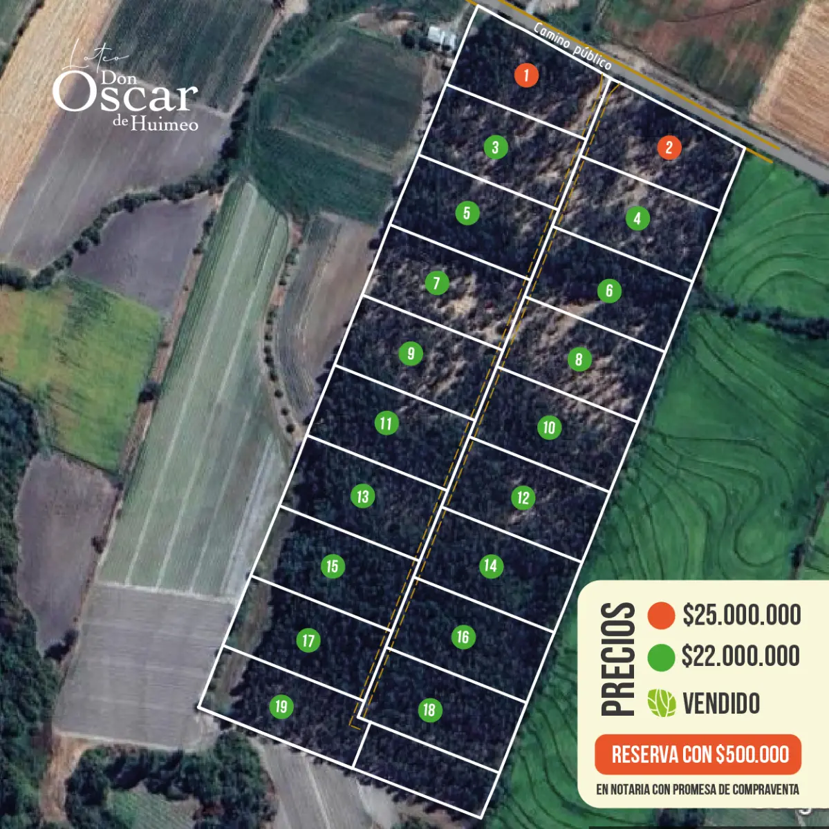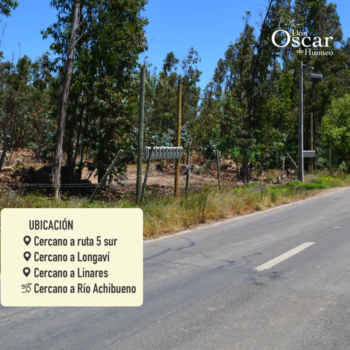 En la comuna de Longaví sector Huimeo lanzamos el loteo Don Oscar de Huimeo, parcelación de 20 lotes de 5.000 m2, todas de superficie plana, con y sin árboles.