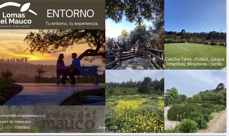 EL EXCLUSIVO BARRIO LOMAS DEL MAUCO CUENTA CON AGUA POTABLE DE ESVAL Y ELECTRICIDAD,SUS CALLES ESTAN ASFALTADAS, AREAS VERDES,SECTOR DE JUEGOS INFANTILES, SENDEROS RODEADOS DE NATURALEZA, MIRADORES, ZONA DE CANCHA DE DEPORTES, MAQUINAS DE EJERCICIOS, PLAZA INTERIOR DE DESCANSO. TODO ESTO PARA PODER DISFRUTAR DE UN GRATO AMBIENTE FAMILIAR,