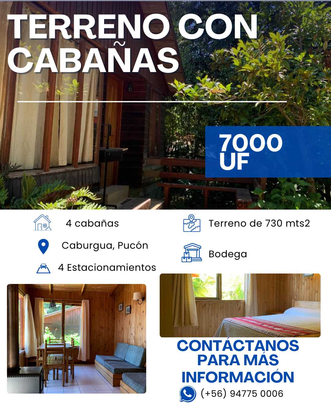 Código KUTT : 153102 | Descubre una joya única en el corazón de Caburgua, Pucón, un lugar donde los sueños de vivir rodeado de naturaleza se hacen realidad. Este generoso terreno de 730 m² te ofrece una oportunidad incomparable para dar vida a la residencia que siempre has deseado o como inversión visionaria en una de las zonas más codiciadas de la Región de la Araucanía, ya que cuenta con cuatro cabañas y una bodega. La dos cabañas más grandes c/u tiene 70 mts2 y las más pequeñas 50 mts2, la quinta cabaña (recepción, bodega, o posible alojamiento para la persona que administra) tiene 30 mts2, abastecidas y equipadas de lo necesario para hacer andar un buen negocio. Además, cuenta con cuatro estacionamientos para tu convivencia o para la de tus clientes.
