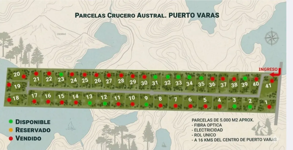 Hermosas parcelas a 16 km de Puerto Varas y a 20 km de Puerto Montt, a solo 15 minutos del Jumbo, Colegio Alemán y Mall Doña Ema, Parcelas Planas, todas con vistas a los volcanes Osorno y Calbuco, electricidad instalada, fibra óptica, crédito propio, toda la documentación al dia e inscrita en el Conservador de PtoVaras, cada una con su Rol del SII, escritura inmediata en Puerto Varas o Santiago.