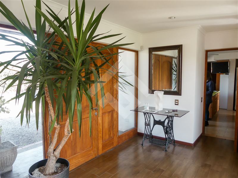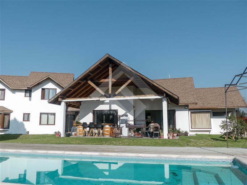 Amplia terraza, piscina, jardín formado, árboles frutales, dos estacionamientos techados.