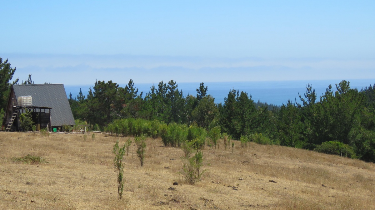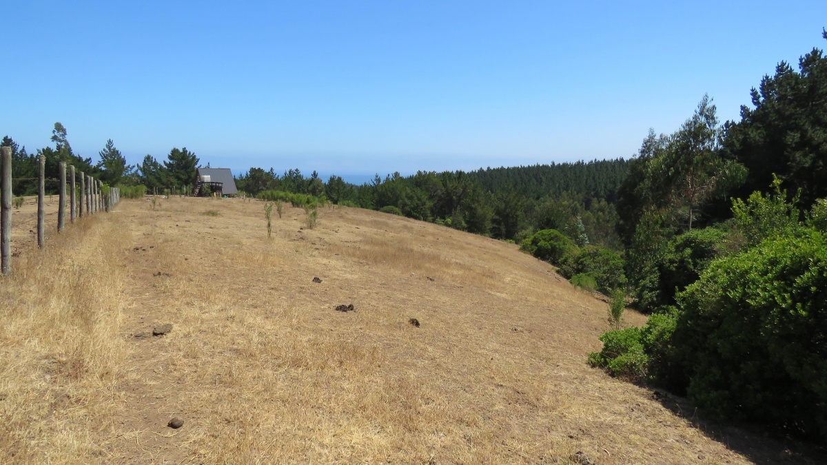 Vista al mar de su parte alta, preciosas praderas de lomaje suave, sector de eucaliptus y riachuelo con bosque nativo.
