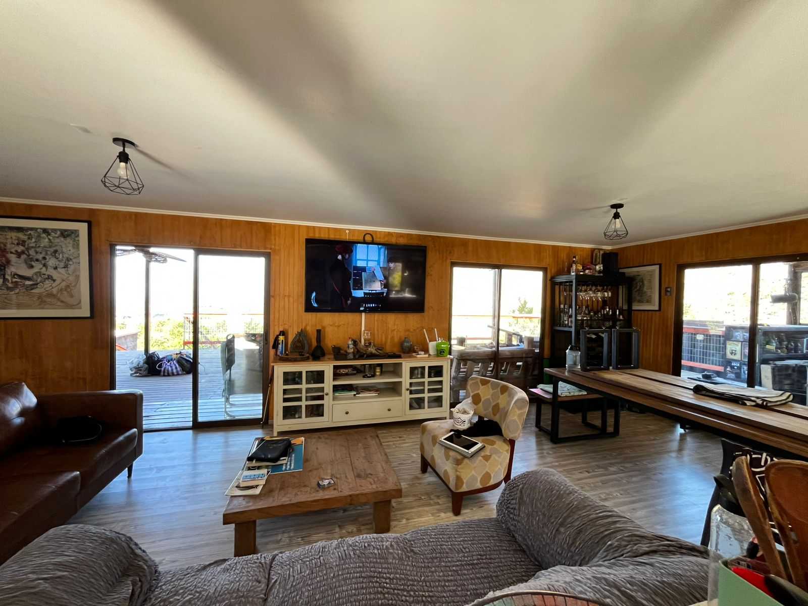 Gran quincho de 80 metros cuadrados techado, equipado con parrilla y bar.